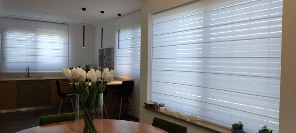 וילון גלילה המורכב בצורת פסים לרוחב , פס אטום ופס רשת וכן שתי שכבות בדים, החפיפה בין הבדים מאפשרת משחק בין בד הרשת לבד האטום